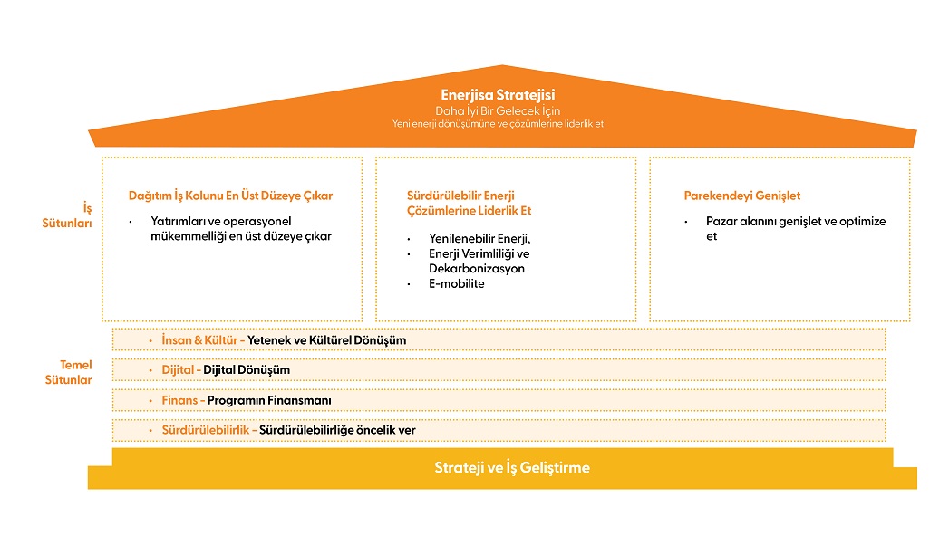 Enerjisa Enerji, hedeflerine ulaşmak ve geleceğe hazırlanmak amacıyla herkes için daha iyi bir gelecek vizyonu doğrultusunda stratejik bir plan geliştirdi. Stratejimiz üç “iş sütunu” ve “temel sütunlar” üzerine inşa edilmiştir. Öncü insan ve kültür uygulamalarıyla desteklenen, son teknoloji ürünü dijital yeteneklerle tesis edilen, sağlam mali kaynaklarla tanımlanan ve ÇSY hedefleriyle motive edilen strateji, Enerjisa Enerji’yi enerji dönüşümünde ve yeni enerji çözümlerinde lider olarak konumlandırmayı ve dağıtım, perakende ve müşteri çözümleri iş kollarında maksimum performansı sağlamayı amaçlamaktadır: