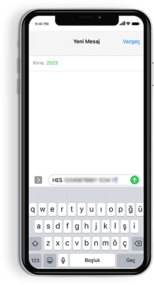 Type HES, your Turkish Republic ID number, last 4 digits of the serial number of your Turkish Republic ID Card, and sharing time (in days) ensuring that there is a single space between all,