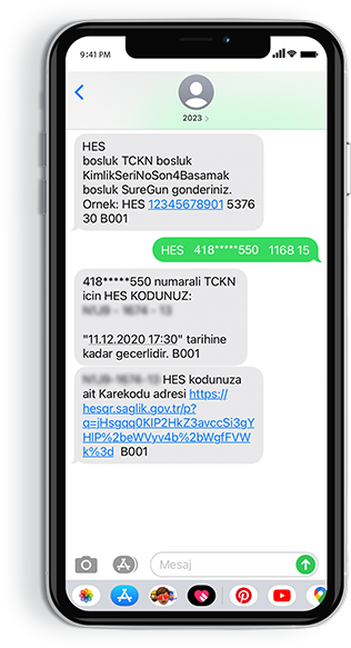 For people who do not have a Turkish Republic ID card or foreigners’ ID (starting with 97, 98, 99) with passport information, by sending a text message to 2023 starting with HES and then your Nationality, the Serial Number of your Passport, year of birth, and Surname, ensuring that there is a single space between all,şluk bırakarak sırasıyla; Uyruk, Pasaport Seri Numarası, Doğum yılı, Soyadı yazarak 2023'e SMS göndererek,