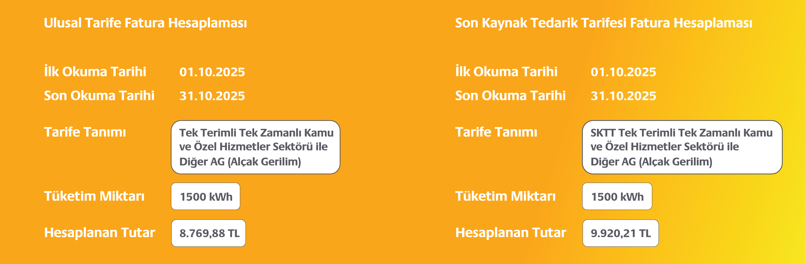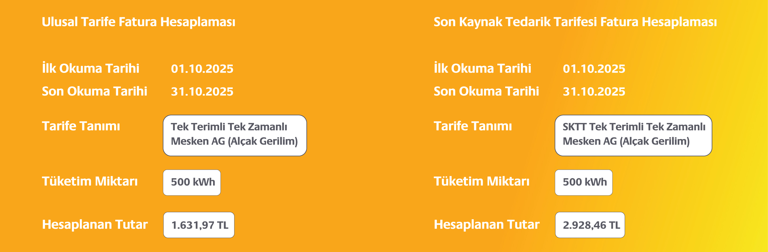 Aylık toplam tüketimi 500 kWh olan bir Mesken abonesinin hem Perakende Satış Tarifesi (Ulusal Tarife) için hem de Son Kaynak Tedarik Tarifesi için örnek fatura hesaplaması aşağıdaki gibidir.