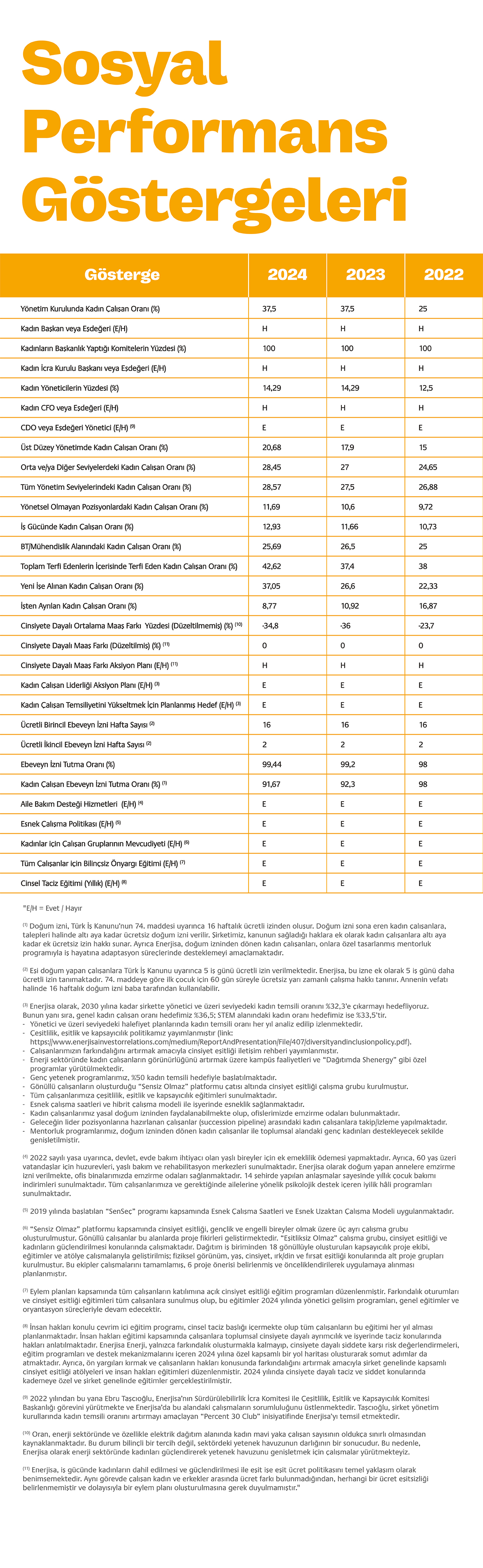 Enerjisa Enerji olarak, çalışanlarımız ve paydaşlarımız üzerinde olumlu etkiler yaratma taahhüdümüzü yansıtan sosyal performans göstergelerimizi açık bir şekilde paylaşarak şeffaflık ve hesap verebilirlik konusunda kararlılığımızı gösteriyoruz.
